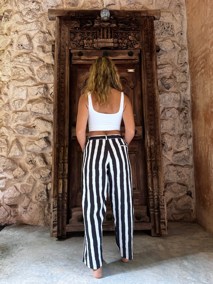 Pantalón Mili de lino con diseño de rayas verticales en blanco y negro.
