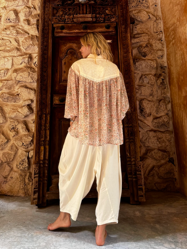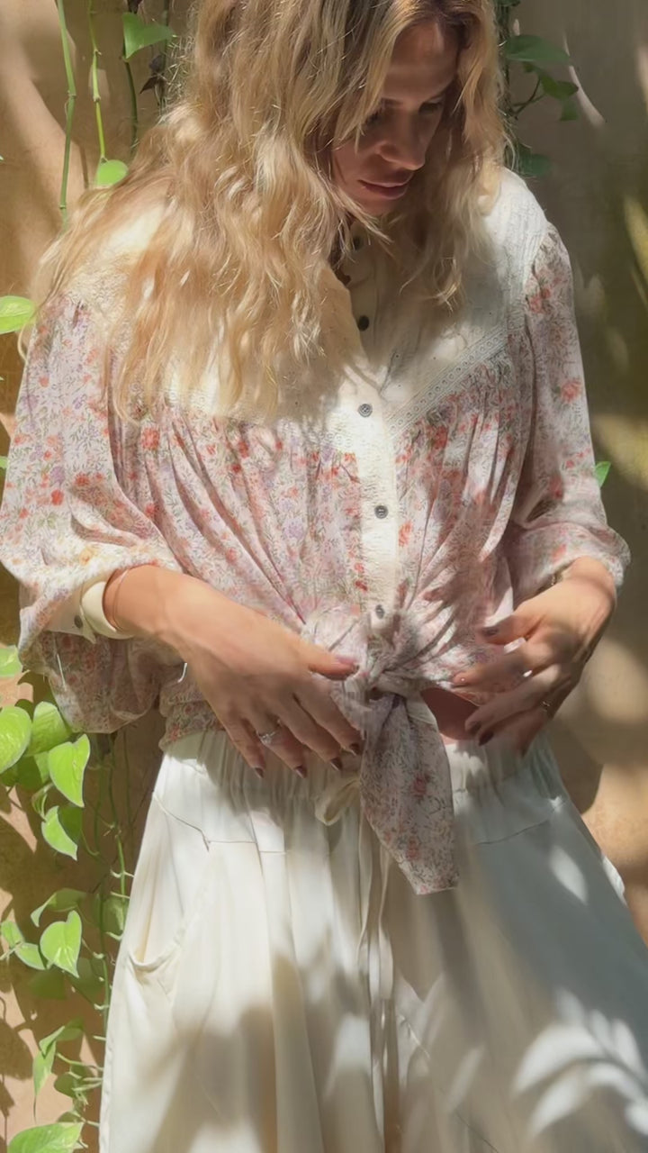 Nuestra camisa Daisy esta confeccionada con una tela vaporosa, suave y fresca al tacto. con un delicado estampado de flores pequeñas que aporta un aire romantico y natural.