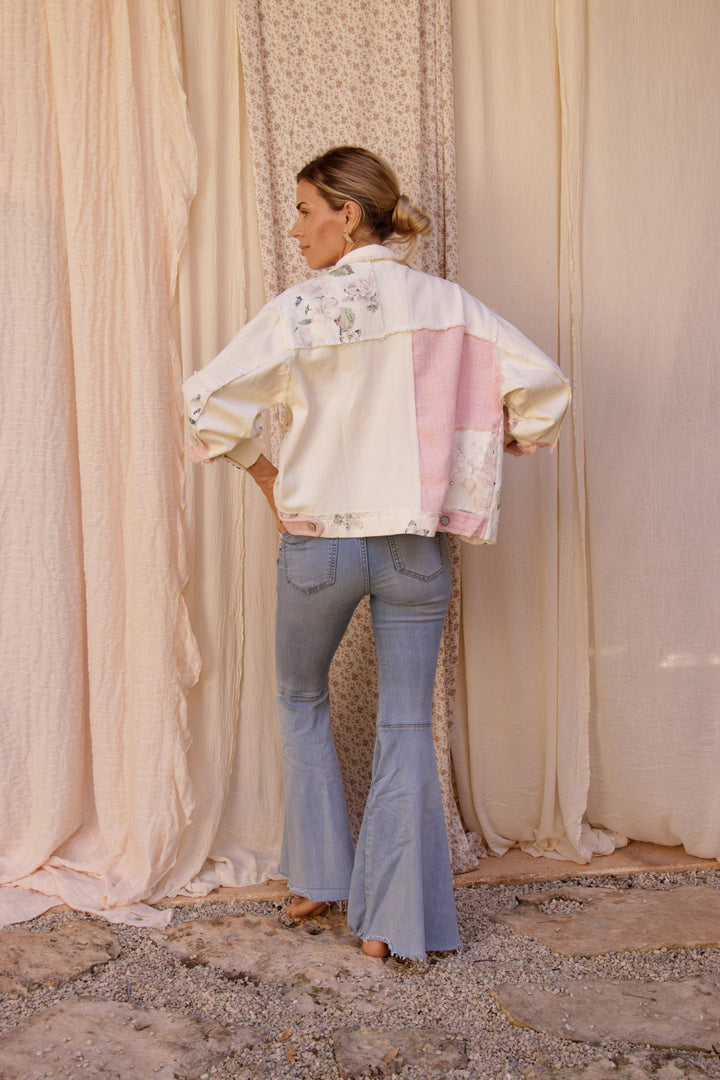 Nuestra Chamarra Magnolia Patchwork combina telas suaves en tono mantequilla con parches en rosa y estampados florales delicados que le dan un estilo romántico y artesanal.