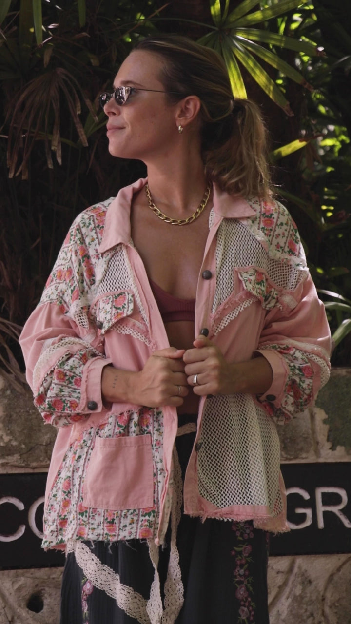 Nuestra chamarra patchwork es una pieza unica de inspiracion bohemia que combina texturas y estampados en un diseño artesanal y lleno de caracter. Esta confeccionada con aplicaciones florales, paneles tejidos tipo red y mezclas de telas que le dan un aure romatico y vintage.