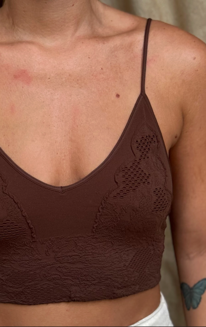 Top de tirantes finos confeccionado en tela ligera con sutil textura de flores que aporta un toque de elegancia y frescura.