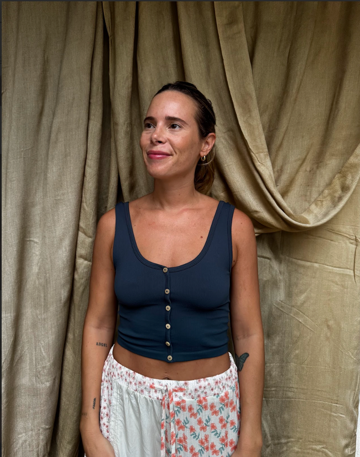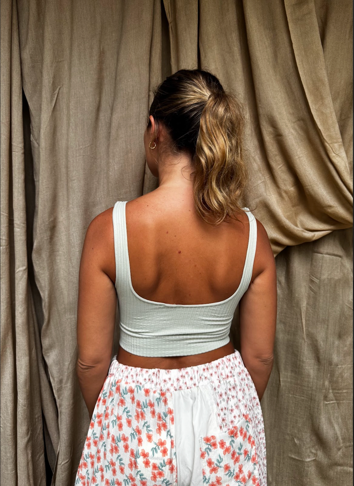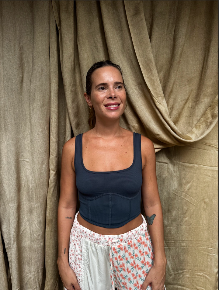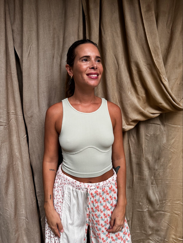 Top tipo corset confeccionado en tela ligera con sutil textura que aporta un toque de elegancia y frescura.