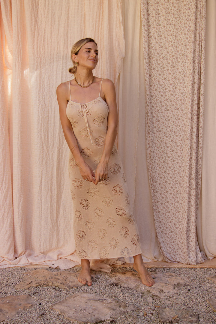 Nuestro vestido tejido arena es un vestido largo y liviano, confeccionado en tejido calado color arena que deja entrever la piel de forma sutil y delicada.